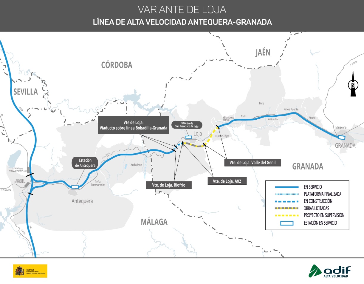 Este contrato permitirá continuar con la doble vía desde Antequera, en concreto en el tramo Variante de Loja-A 92, de 6,3 kilómetros de longitud, desde el área de servicio de Los Abades , en la margen sur de la autovía A-92, concluyendo en un punto intermedio entre las poblaciones de Loja y Salar, también al sur de esta carretera.
