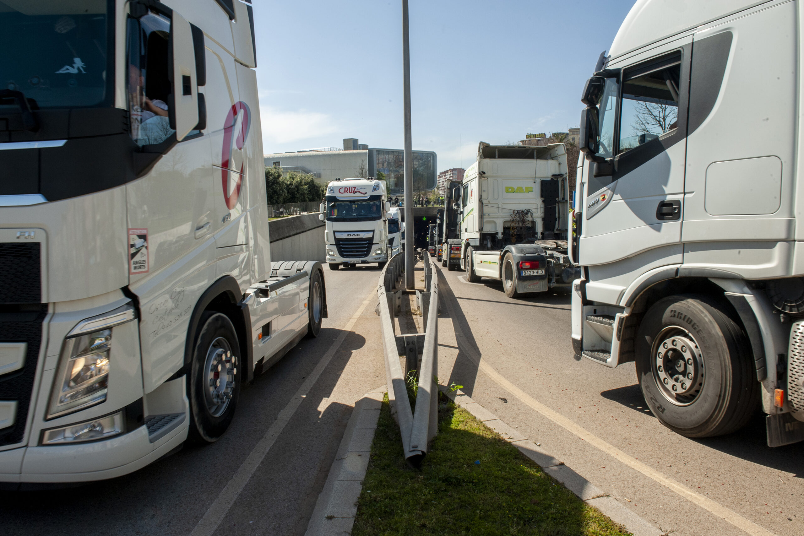 Además, ya al mediodía se han sumado a la protesta todoterrenos, vehículos con remolques y grúas, mientras que taxistas y conductores de VTC trataron de unirse a la marcha esta mañana en la salida, que tuvo lugar en el Puerto de Raos, pero no pudieron al no contar con la autorización de la Delegación del Gobierno.