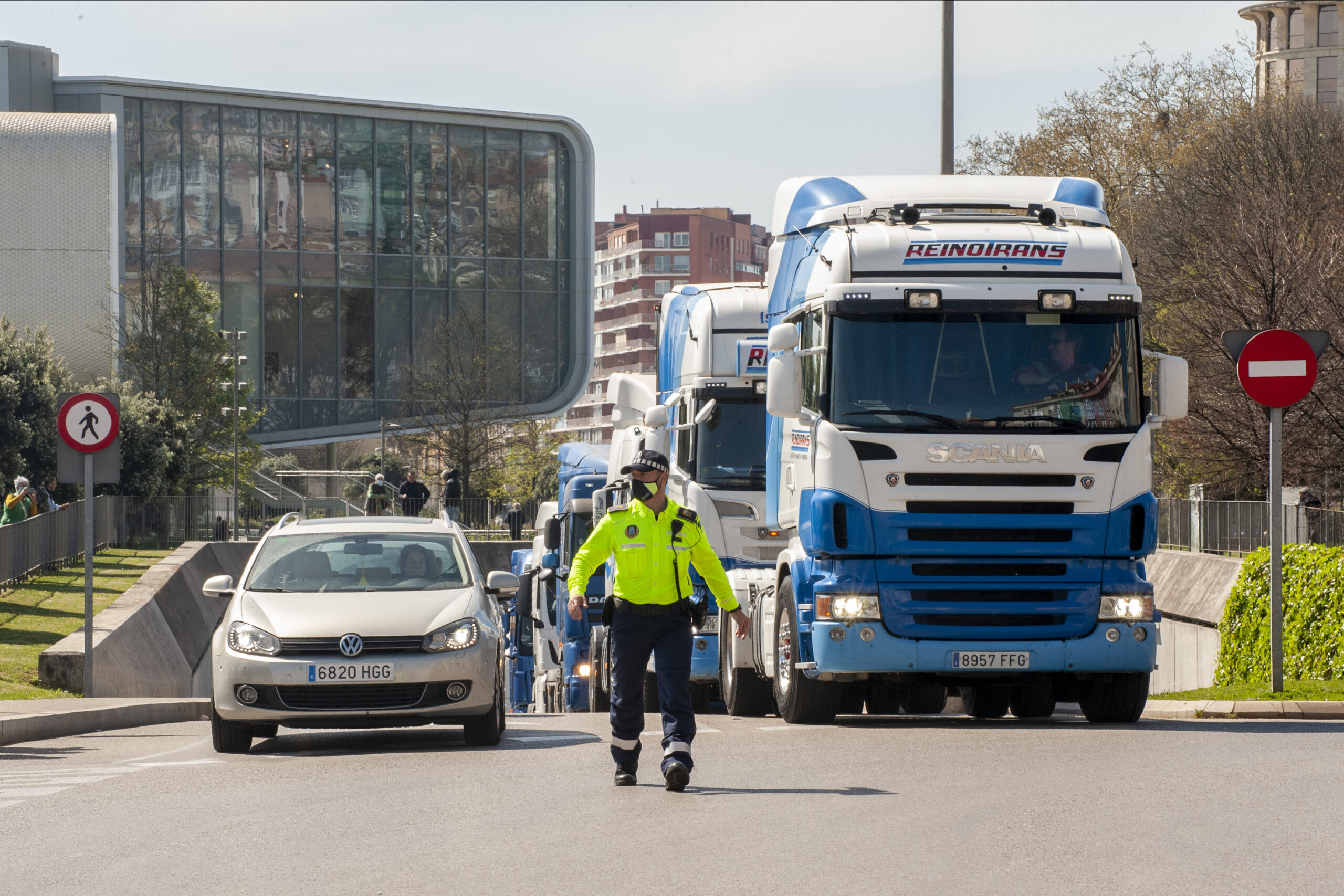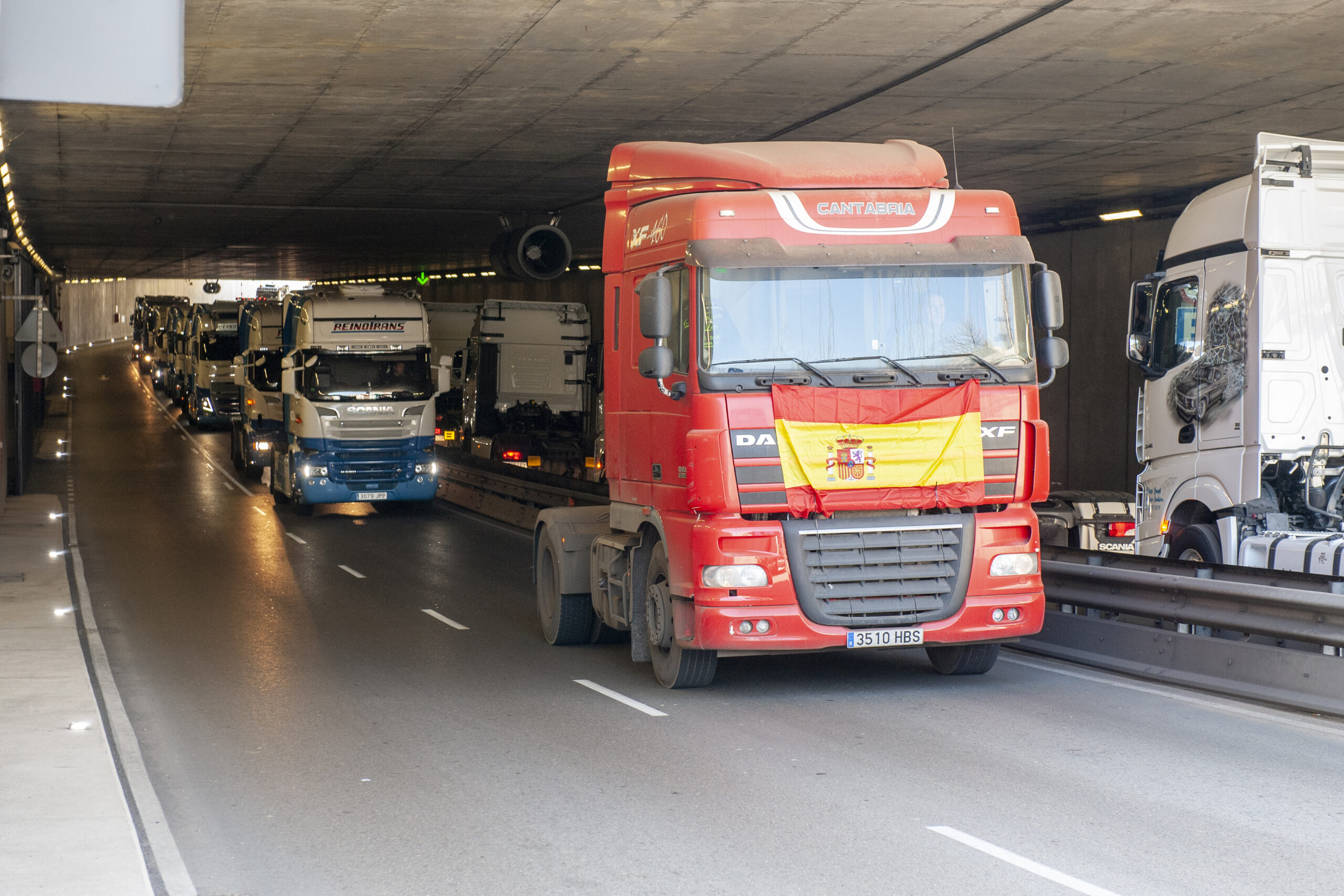 En paralelo al paro y las protestas siguen saliendo convoyes escoltados, por lo que se calcula que hoy hay más de medio millar de efectivos de Policía Nacional y Guardia Civil desplegados tanto para controlar la caravana por el centro de Santander como para proteger de los piquetes a los transportistas que sí están trabajando.