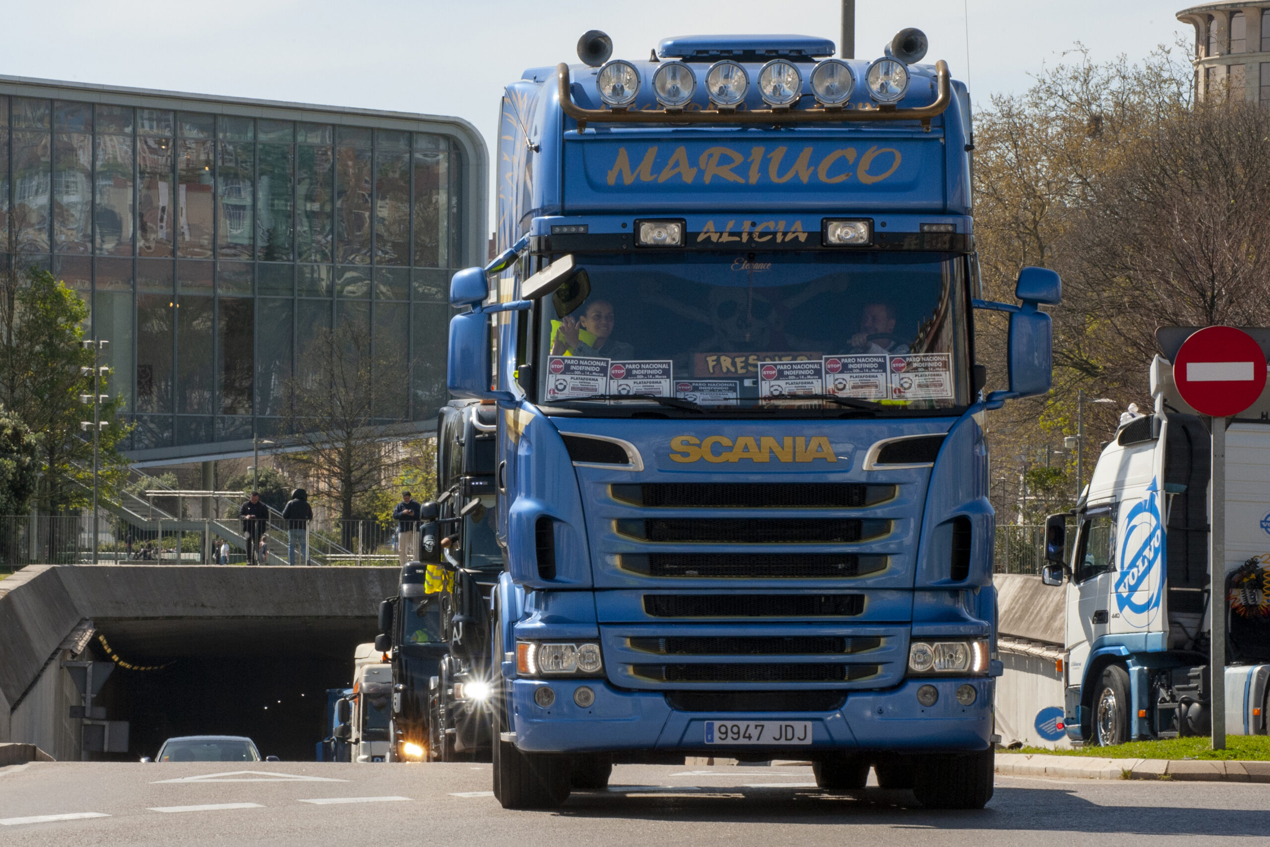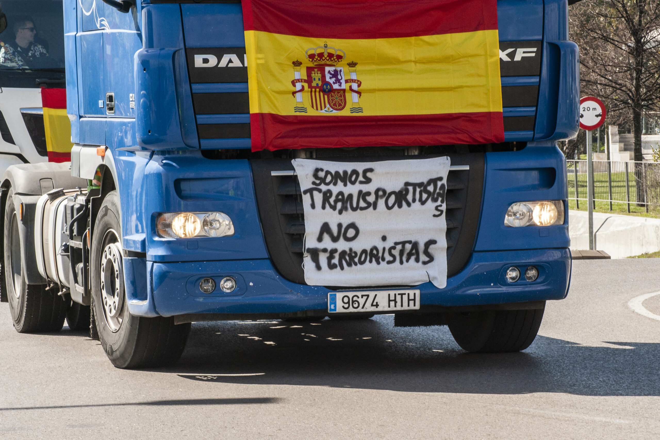 También había alguna pancarta en defensa del mundo rural, ya que se han sumado camiones de transporte de ganado y vehículos con remolques, cuyas inscripciones pedían ‘precios justos’ y decían ‘no a la inclusión del lobo en el listado de especies protegidas’, o ‘Ganadero vivo, ganadero protegido’.