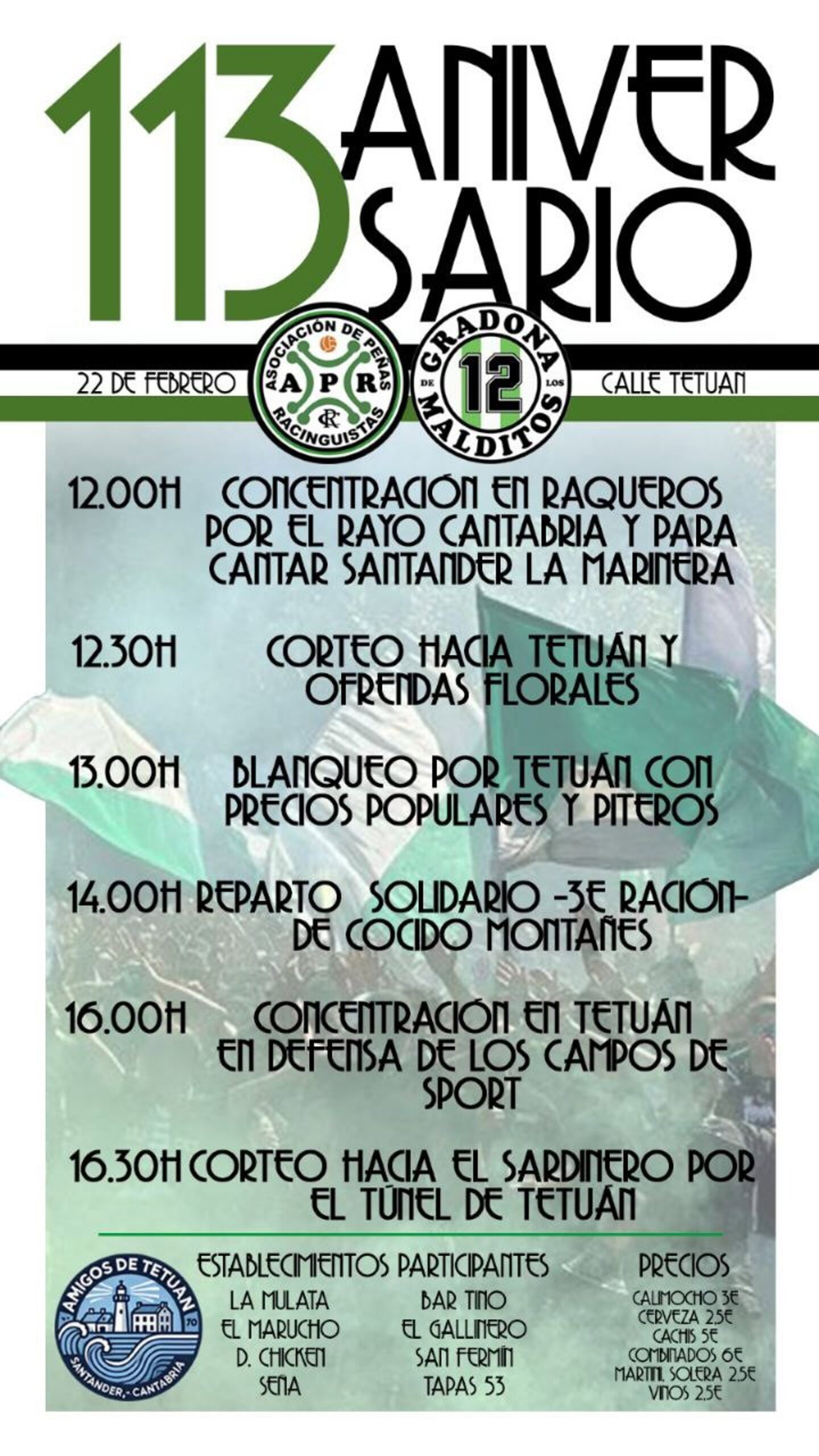 Las peñas racinguistas celebrarán este domingo, 22 de febrero, varios actos para conmemorar el 113 aniversario del club que también incluyen una concentración en Tetuán para denunciar la situación de los Campos de Sport de El Sardinero.