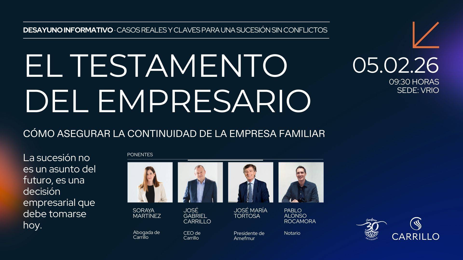 «La experiencia nos demuestra que la mayoría de empresarios abordan su sucesión demasiado tarde o sin el asesoramiento adecuado, lo que genera situaciones que podrían haberse evitado», señala José Gabriel Carrillo, CEO de Carrillo. «Esta jornada pretende mostrar, con casos reales, que no existen soluciones estándar y que cada empresa familiar requiere un análisis personalizado».