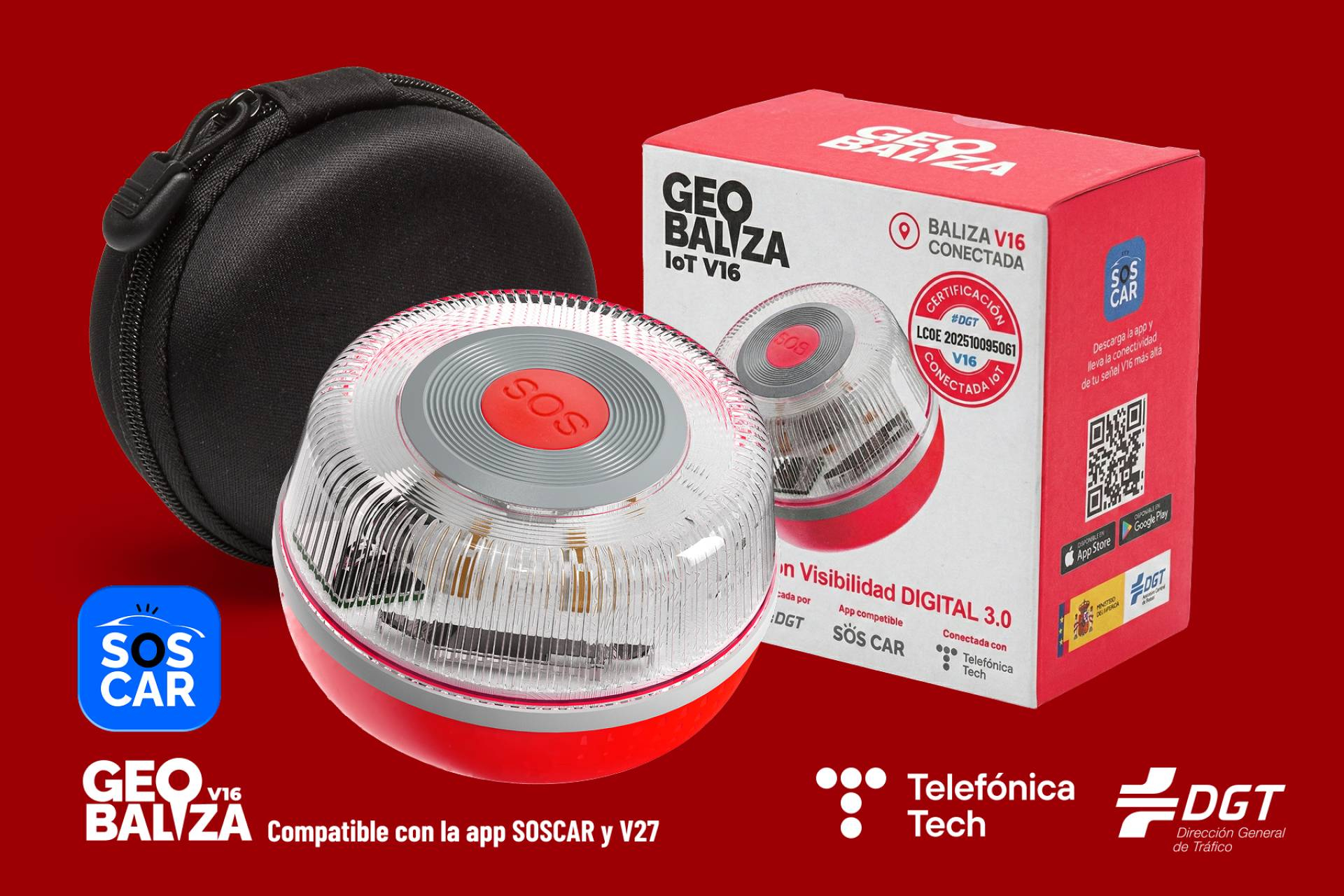 Homologada por la Dirección General de Tráfico (DGT), acorde con la nueva normativa 2026 es un dispositivo diseñado para ofrecer la máxima seguridad, simplicidad y eficacia ante cualquier incidente en carretera. Gracias a su tecnología integrada y a su diseño robusto, esta baliza sustituye definitivamente a los tradicionales triángulos de emergencia y gracias a la nueva app SOSCAR, ya incorpora la visualización de las diferentes Balizas V16 Conectadas mediante el sistema de triángulo virtual V27.