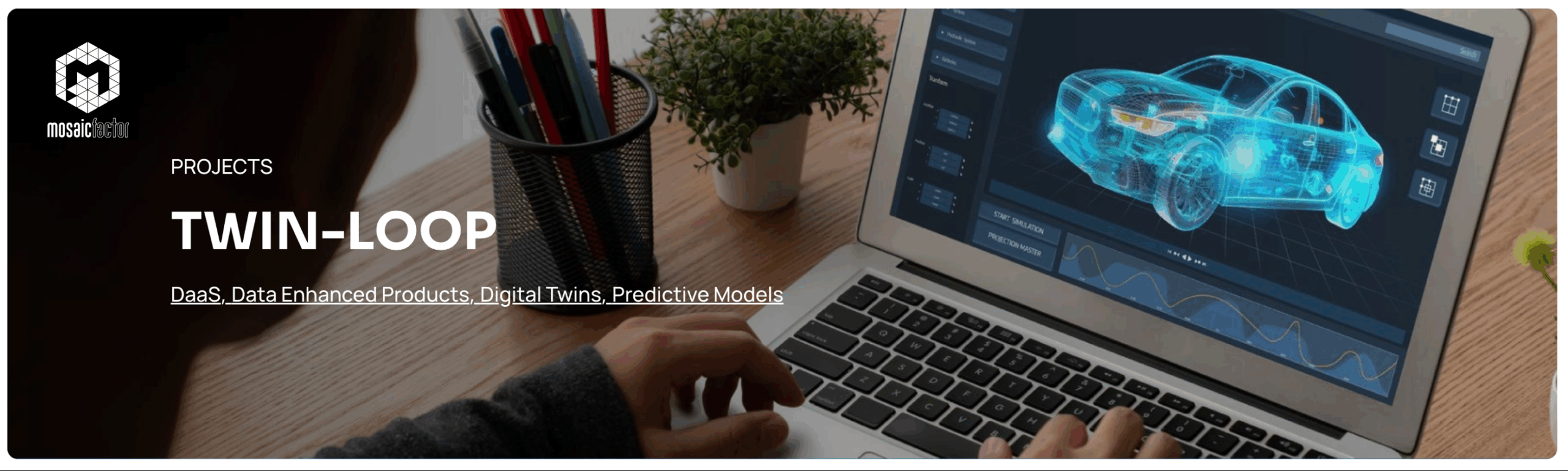 Entre sus iniciativas más destacadas se encuentran los proyectos europeos Twin-Loop y HIDDEN, ambos coordinados por Mosaic Factor en el marco del programa Horizon Europe. Twin-Loop desarrolla un marco abierto para la operación de gemelos digitales (TwinOps) aplicados a vehículos eléctricos definidos por software (SDVs), combinando computación de alto rendimiento y digitalización para mejorar el consumo energético, la experiencia del conductor y la resiliencia del vehículo. Por su parte, HIDDEN (Hybrid intelligence for advanced collective perception and decision making in complex urban environments) se enfoca en la detección oportuna y confiable de objetos ocultos, especialmente de los usuarios de la carretera vulnerables, integrando capacidades humanas y algoritmos de toma de decisiones para un resultado más robusto y ético.
