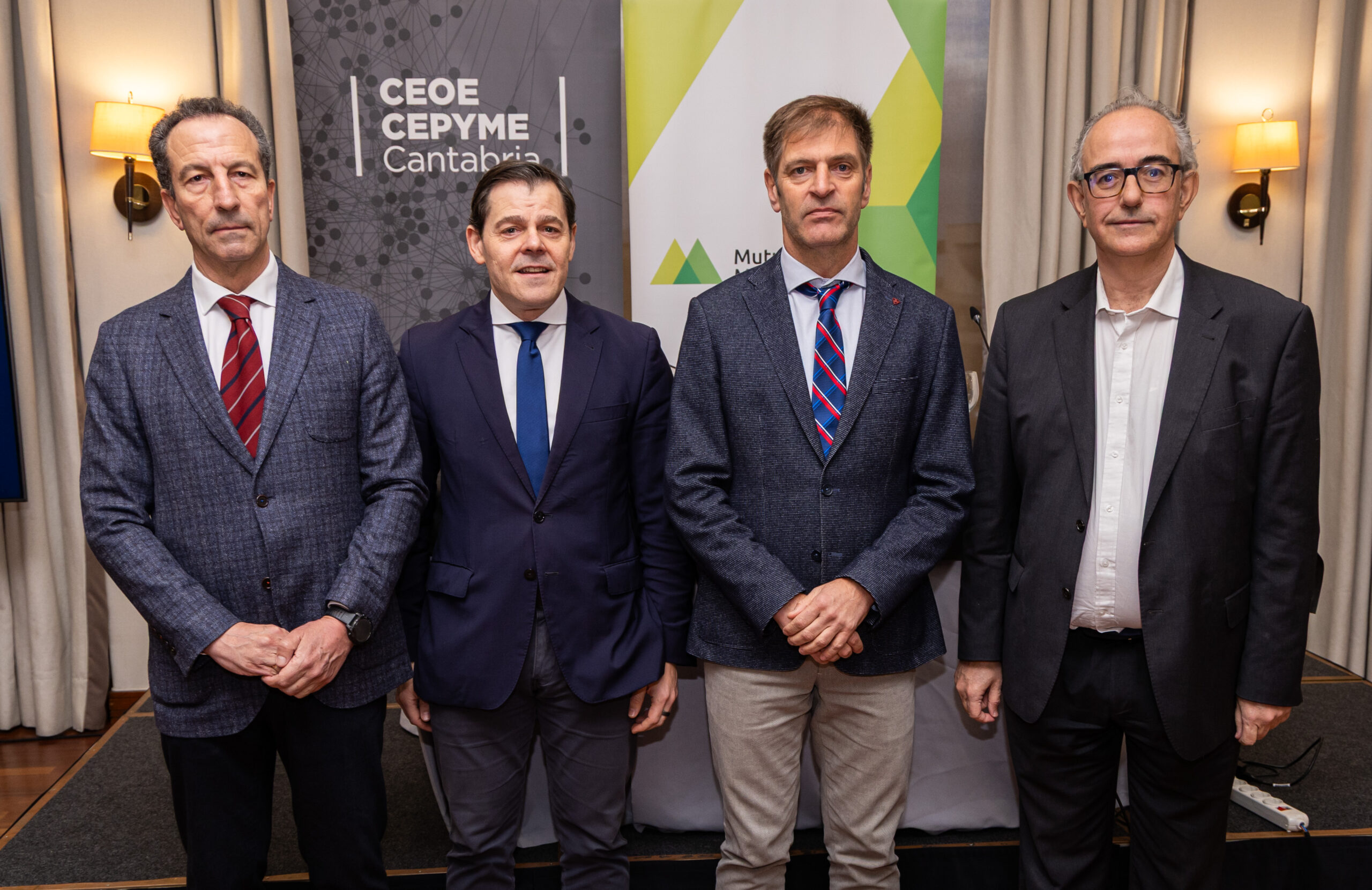 Ricardo Sanchís, director gerente del Hospital Santa Clotilde; Alberto Martínez Lebeña, director gerente de Mutua Montañesa; Enrique Conde, el presidente de la CEOE-Cepyme Cantabria; y Enrique Gómez, CEO del Grupo Mirat en la presentación del Observatorio de Absentismo elaborado por Mutua Montañesa.