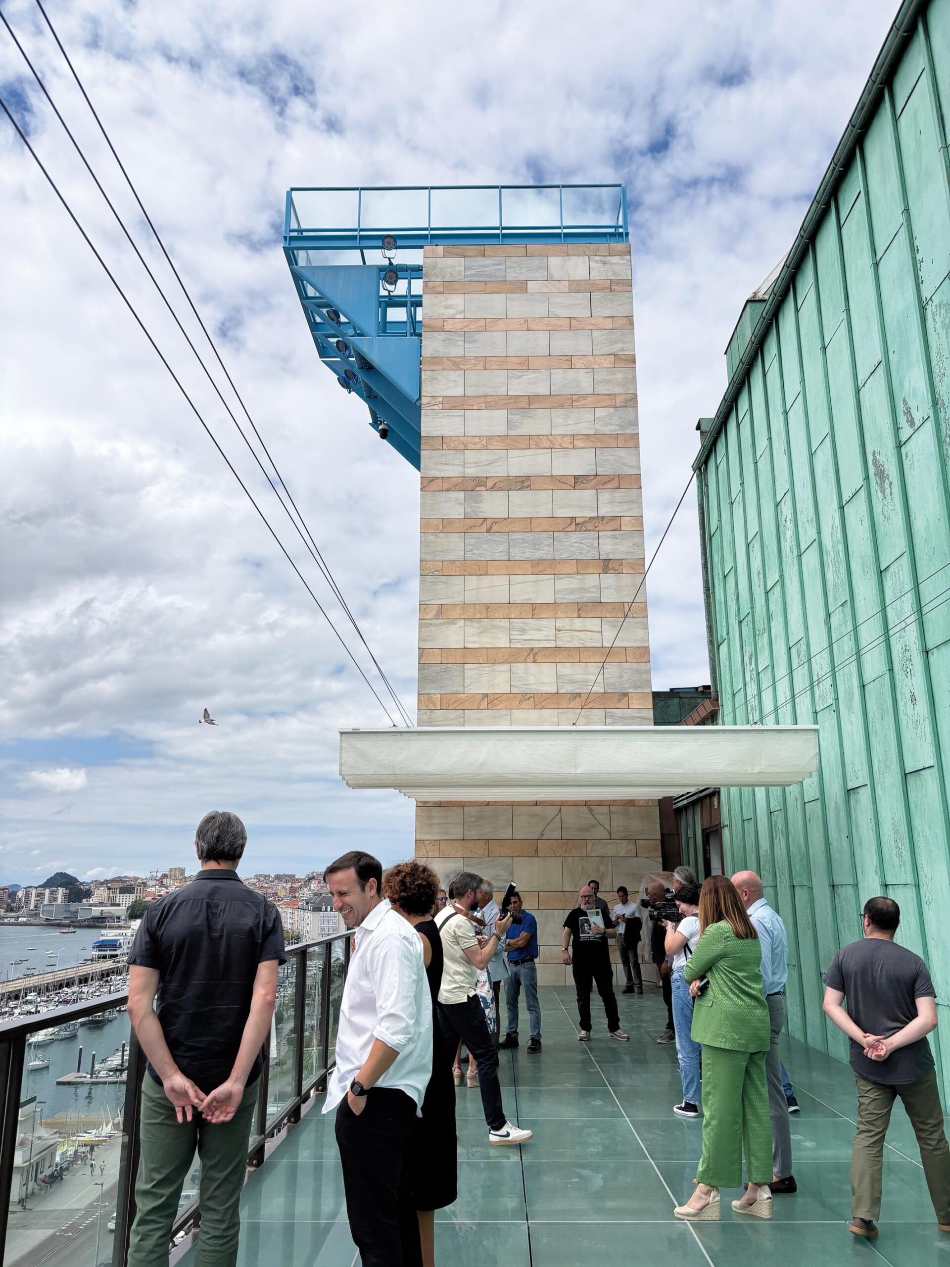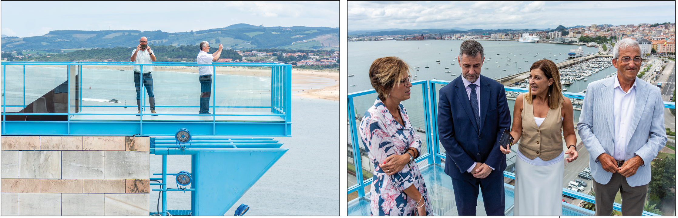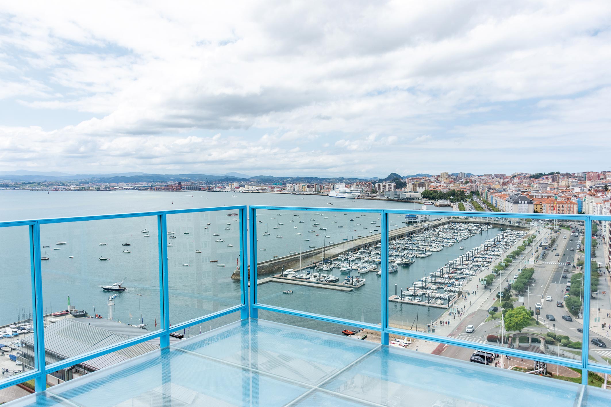 En la parte más alta de estas torres se han instalado unas barandillas de cristal y una estructura metálica de hierro forjado que ofrecen unas vistas inéditas de toda la ciudad, y muy especialmente de la bahía y el Puntal, creando una cierta sensación de vacío.