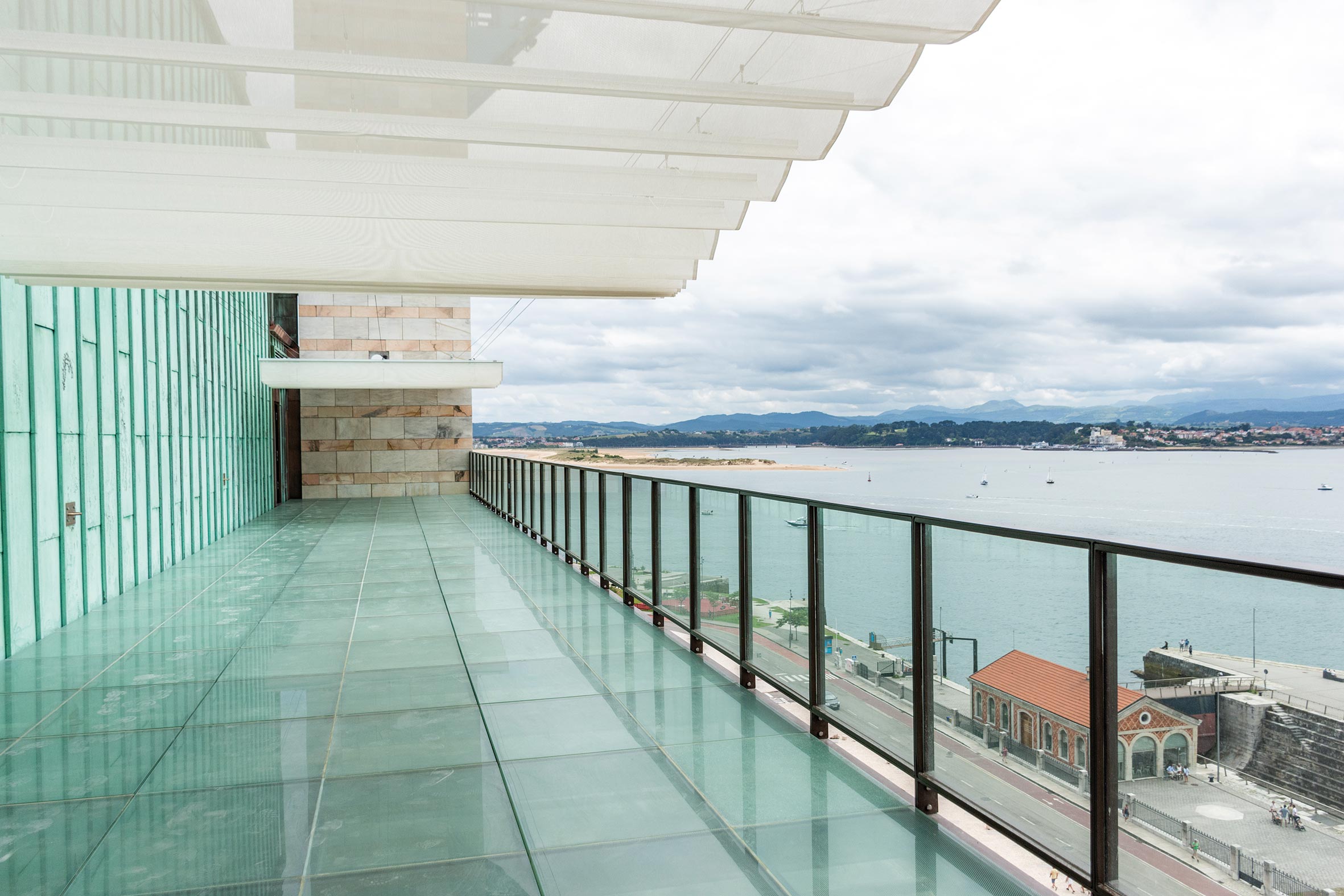 Por debajo de este nivel, a 30 metros de altura, se ha creado una terraza en voladizo, sobre el trapecio que se observa en la fachada sur, situado tras el escenario de la Sala Argenta. Un suelo de cristal de color aguamarina y un antepecho trasparente hacen que parezca una extensión de la propia lámina de agua de la bahía. La aparente levedad de toda la estructura se refuerza con unos parasoles textiles en forma de ondas.